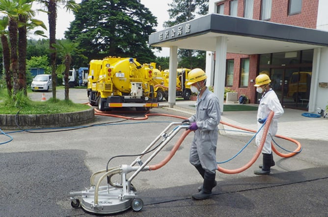 道路や構造物の除染に用いられる「スピンバック工法」にも対応しています。加えて、現場作業をより円滑に進めるための高圧洗浄車やカメラ車などの専用車両は自社で保有しており、効率的かつ柔軟な施工体制を整えています。