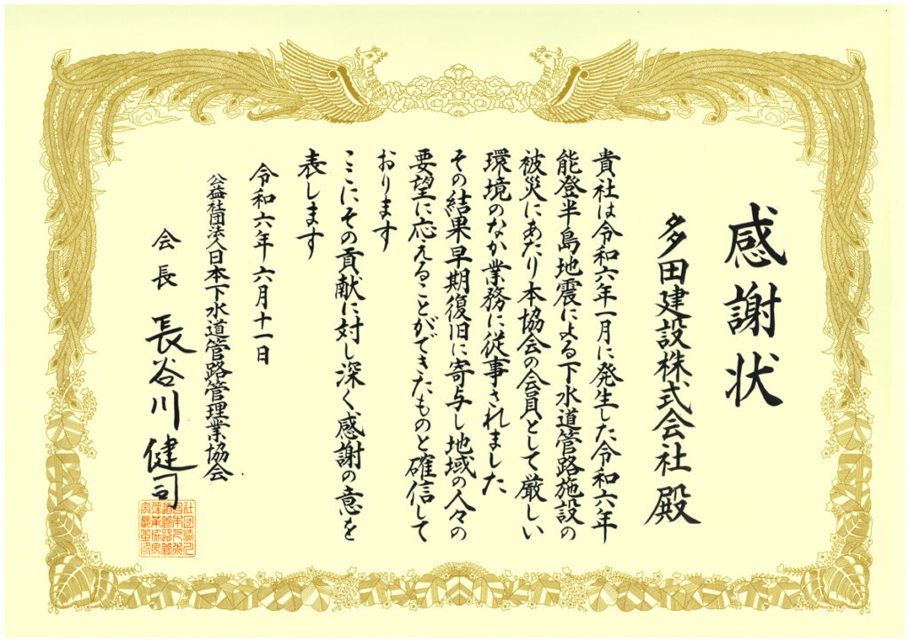 下水道管路施設の災害復旧のための災害調査業務において 日本下水道管路管理業協会より感謝状を頂きました