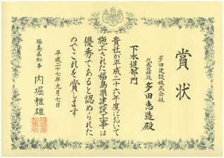当社施工の流域下水道整備工事(管更生)が、優良工事として表彰されました。