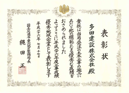 平成26年度 国土交通行政関係功労者表彰式にて、工事成績優秀地域企業として 東北地方整備局長表彰を受賞しました。