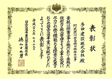 平成25年度 国土交通行政関係功労者表彰式にて、優良工事施工会社として 東北地方整備局長表彰を受賞しました。