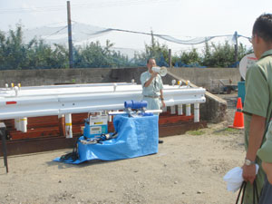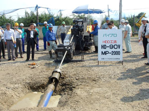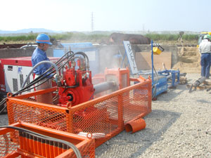 デモンストレーション施工では、バイブロ機能搭載HDD機(HD-90V)と削孔水ユニット(MP-2000)を使用し、地質は、玉石や砂利の混じったところで、150mmのポリエチレン管を引き込みました。
