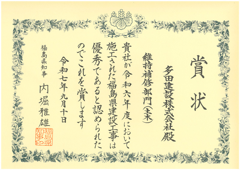 維持補修部門(土木)において、優良建設工事として表彰されました。