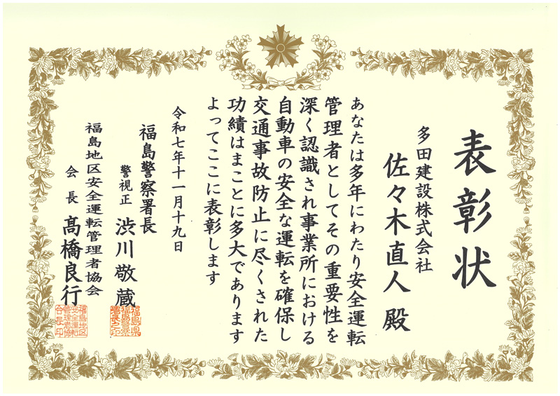 優良安全運転管理者として当社社員が、福島警察署長・福島地区安全運転管理者協会長連名の表彰を受けました。