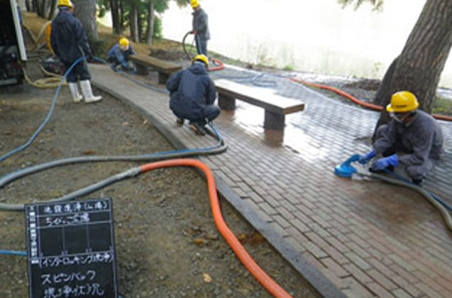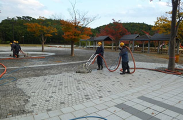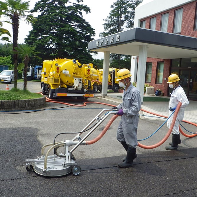 また、洗浄水は、3方向から吸引することにより効率よく排水し、周辺に飛散させることはありません。この吸引システムの採用により、目地やクラックに入り込んだ放射性物質も排出され、除染効果をさらに高めることができます。