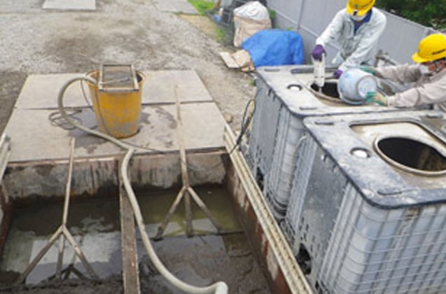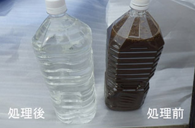 排水処理については、吸引車からの濁水を攪拌タンクに移送し凝集剤により分離させ、フィルターを使用してフロッグを取り除いて排水します。
