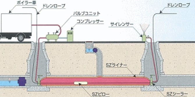SZライナーの端部にSZシーラーを取付け、圧縮空気によりSZライナーを管内に圧着させます。圧縮空気を蒸気に置換することによってSZライナーを硬化させます。