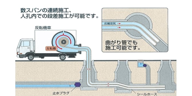 熱硬化性樹脂を含浸させた材料を既設のマンホールから既設管きょ内に反転加圧させながら挿入し、既設管きょ内で加圧状態のまま樹脂を加熱硬化させることで、管の内側に新しくパイプを形成する工法です。