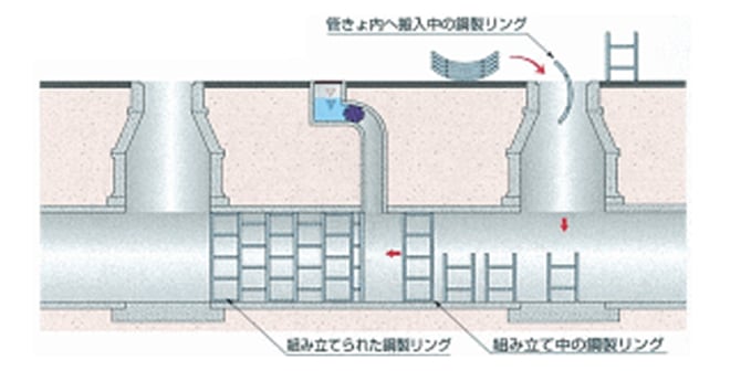分割された鋼製リングを人孔から運び入れ、ボルト結合により鋼製リングを組立てます。