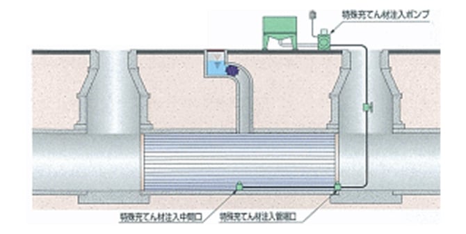 既設管きょとポリエチレン製部材との間に充てん材を充てんすることにより、既設管きょを更正する工法です。