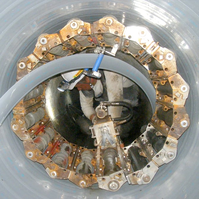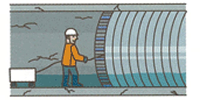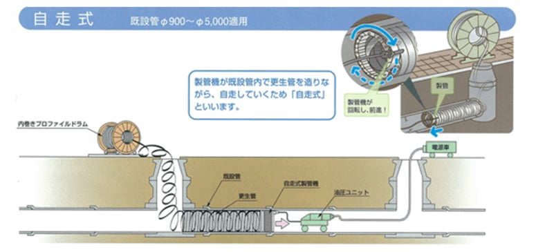 製管機は既設管内でかん合ローラを回転させながら移動し、製管していきます。
