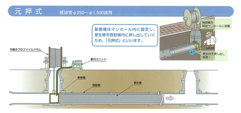 プロファイルを既設マンホールから製管機に供給。マンホール内に設置した製管機のかん合ローラが回転しながら、既設管内に製管していきます。
