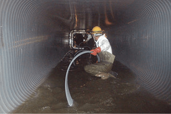 既設管きょと表面部材との間に高流動・高強度特殊充てん材を注入します。