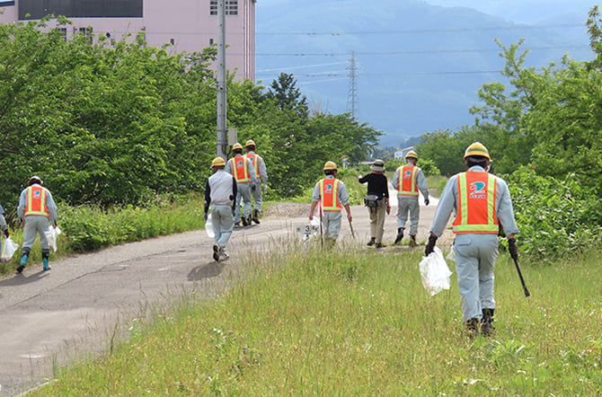 荒川河川敷や本社周辺のクリーンアップ活動をはじめとして、道路パトロール、AED設置協力など、福島周辺地域の安全・安心に貢献する取り組みを継続的に行っています。