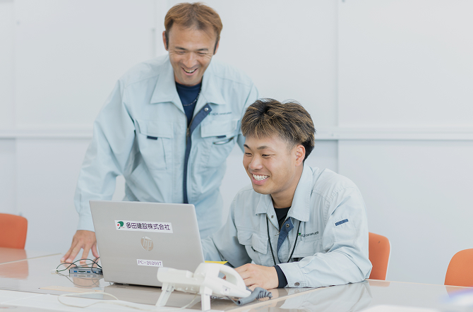 資格取得をサポートして地元の人材を積極的に採用・育成するとともに、フレックスタイム制の導入やリモート会議の実施など、長く働けるための環境を整備しています。