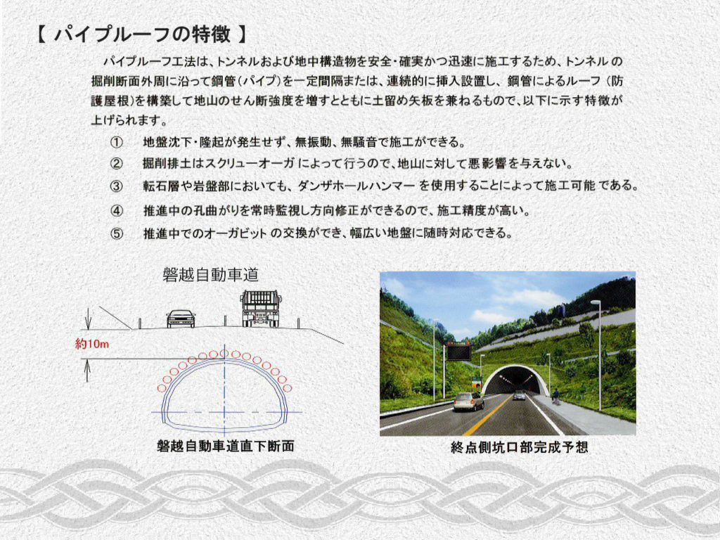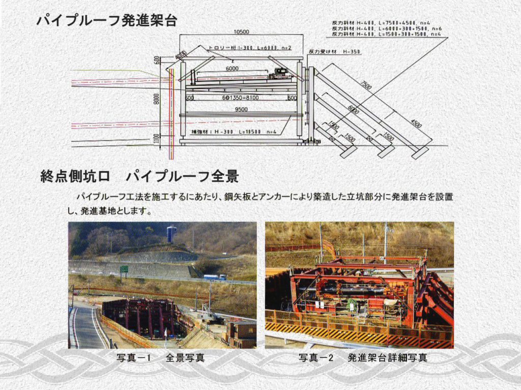 | 主な工種 | パイプルーフ工法φ500 10スパン L=660m |