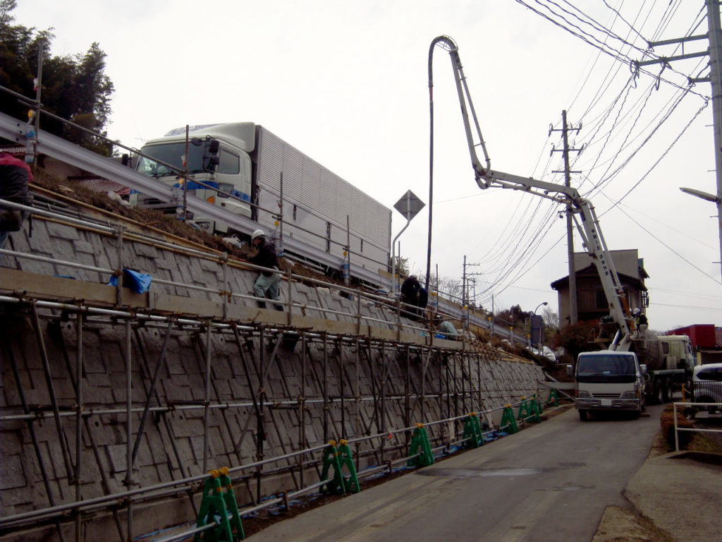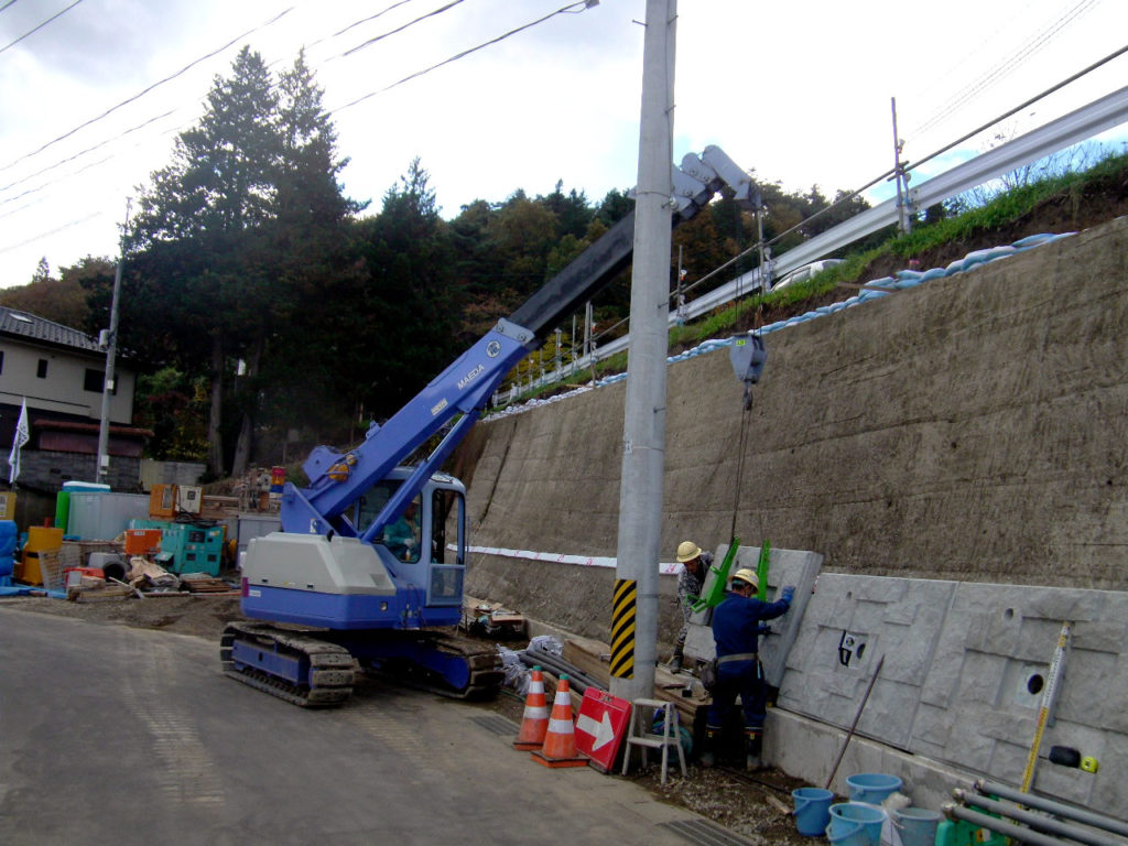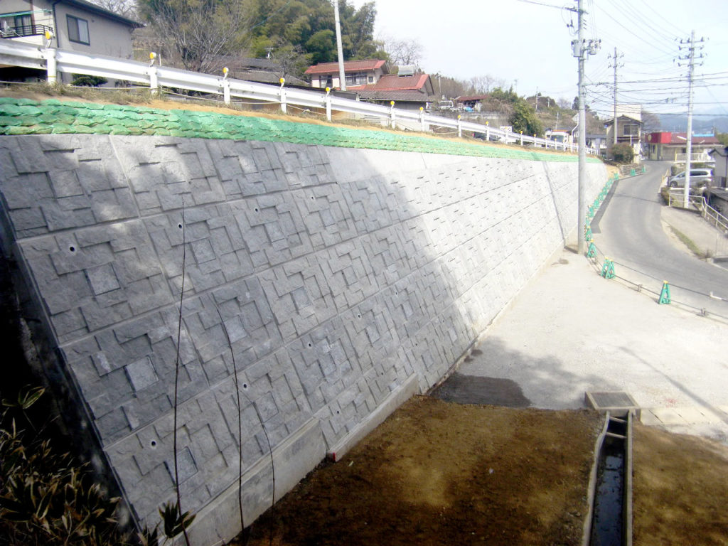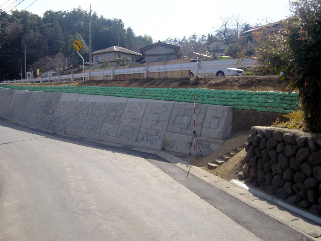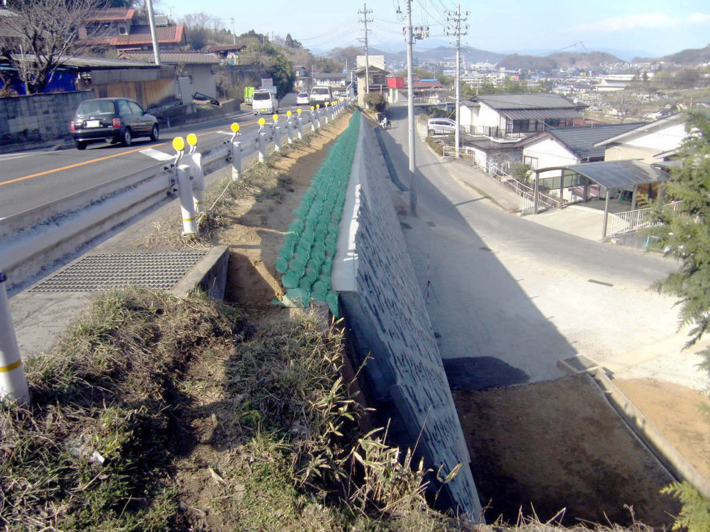 | 主な工種 | 補強土壁工 壁面排水材設置工 119m 目地バックアップ 351m 定着・頭部処理工 111箇所 背面充填コンクリート 76m³ 補強土壁工 天端工 68m 植生土のう積工 27m² 現場内コンクリート 1式 U型側溝撤去再設置工 33m |